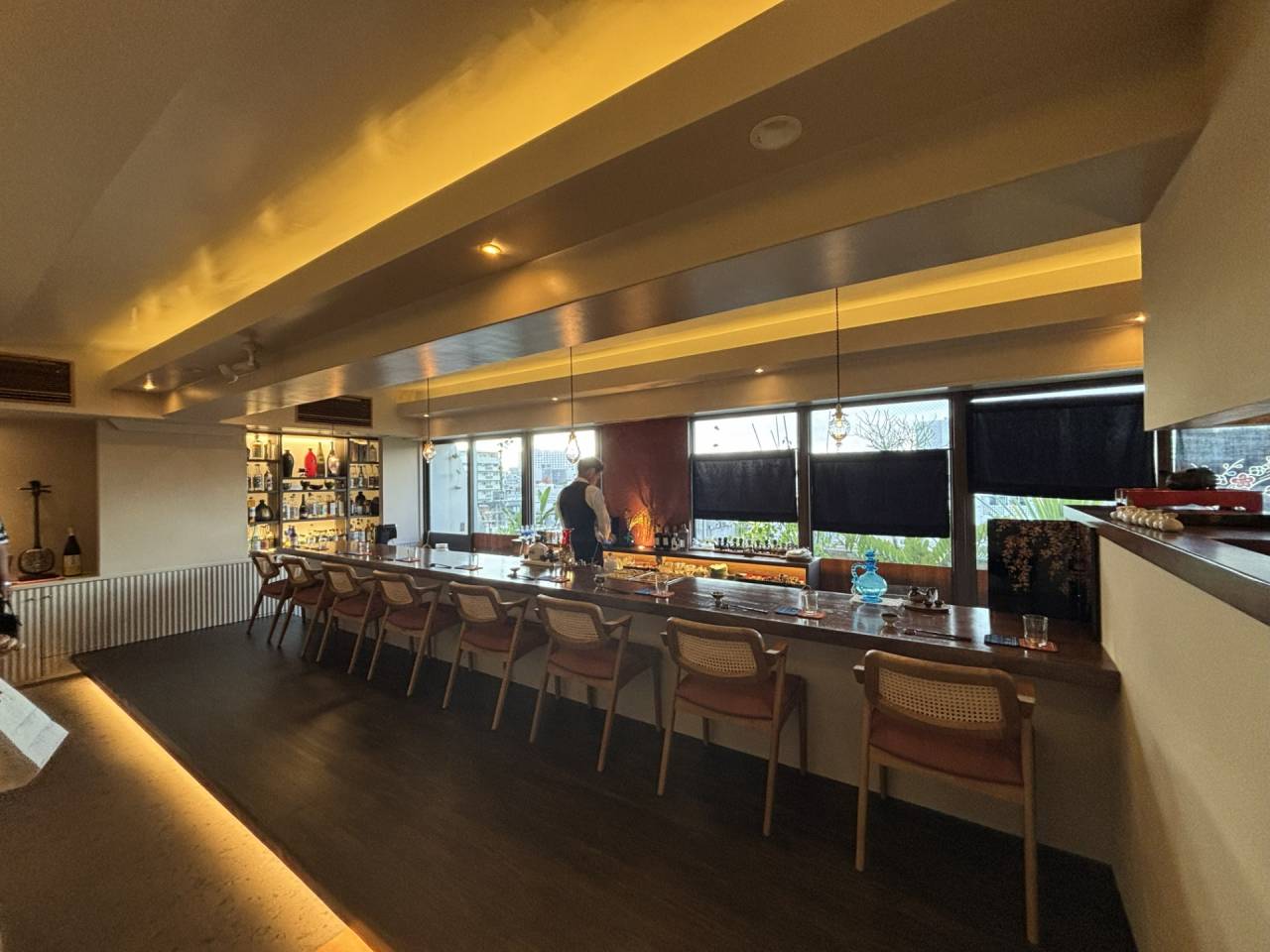 6mのカウンターでは目線の高さを整える床レベル計画により対話の質を高め、個室には琉球石灰岩の版築壁を設えることで、沖縄の風土と職人技を空間として可視化しています。エントランスでは紅型の型紙天井と泡盛が並ぶ棚を組み合わせ、来訪者が足を踏み入れた瞬間から沖縄の文化に触れられる構成としました。