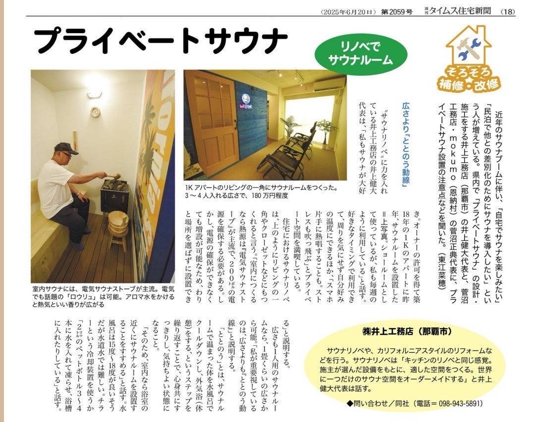 メディア 2025年6月この度、弊社の「井上サウナ」が沖縄タイムス様の「タイムス住宅新聞」にて大きく取り上げられました!記事では、住宅におけるサウナリノベーションの魅力や、プライベートサウナがもたらす豊か…